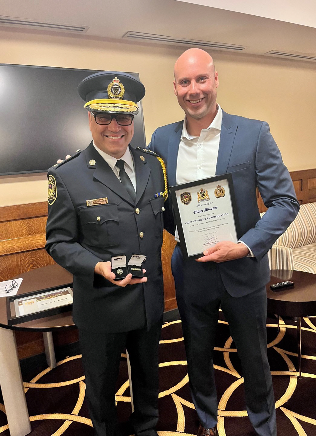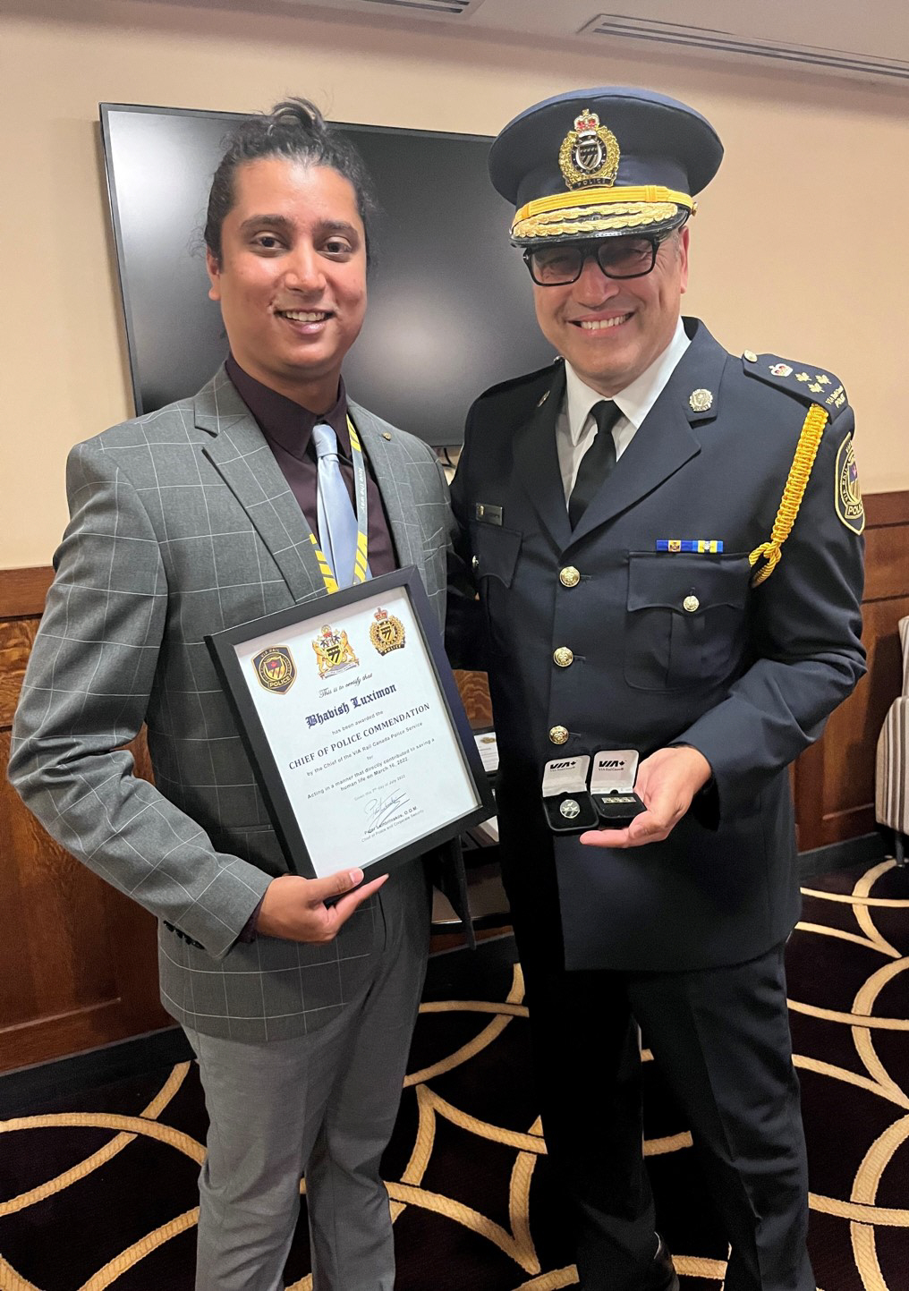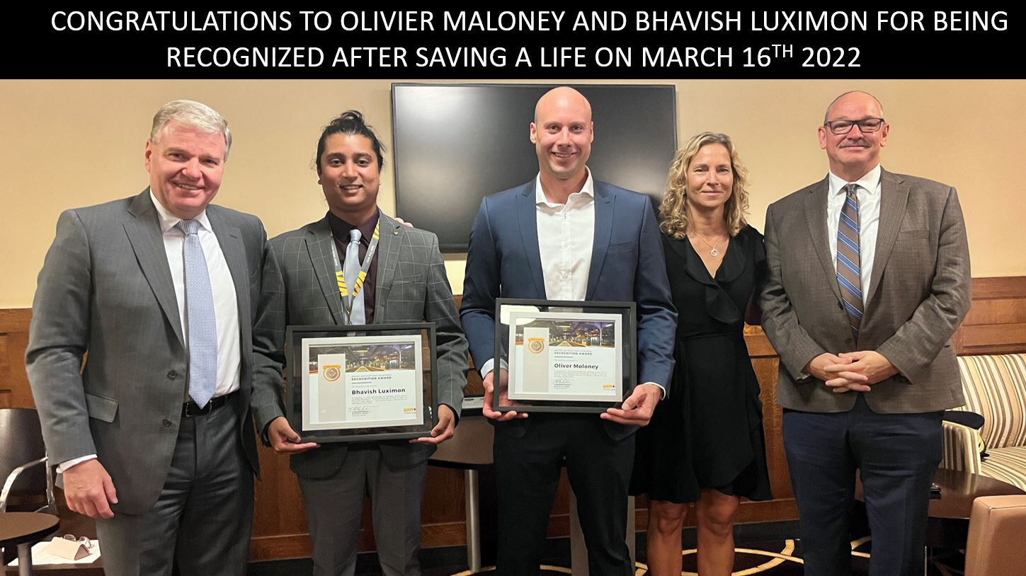 On July 7th 2022 Oliver Moloney and Bhavish Luximon both received the VIA Rail Canada Chief of Police Commendation. This was the first time this commendation was given to a civilian. Oliver and Bhavish were recognized after saving a life on March 16th 2022.